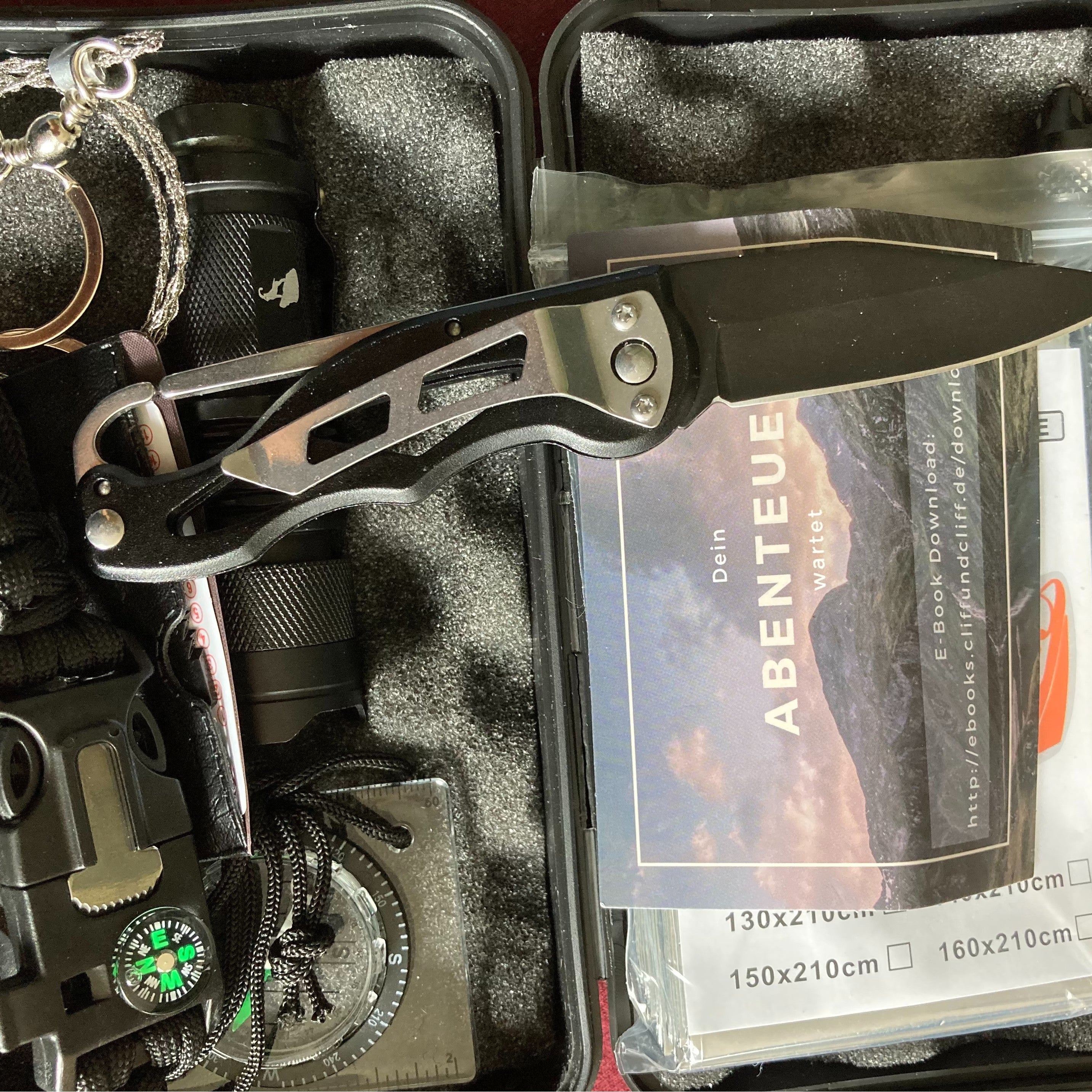 Ich hatte das Survival Kit zusammen mit einer Filter Wasserflasche als Geburtstagsgeschenk für meinen Mann bestellt. Er war begeistert. Der Kompass funktioniert, die Säge ist scharf genauso wie das Messer. Bei dem Messer mussten wir lange überlegen wie es wieder einzuklappen ging. Im Griff gibt es wie einen